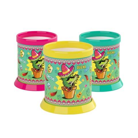 Vidám hangulatú kiegészítőt helyezhetnek el a gyerekek az íróasztalukon, melyben a legfontosabb írószereiket helyezhetik el. A kaktuszos írószertartó praktikus kiegészítő lesz az asztalon, hiszen állítva elhelyezhetik benne a ceruzákat, tollakat, filceket vagy akár ollót is. A mintázatán egy gitározó kaktusz és más mókás motívum jelenik meg, műanyag peremei pedig sárga, t