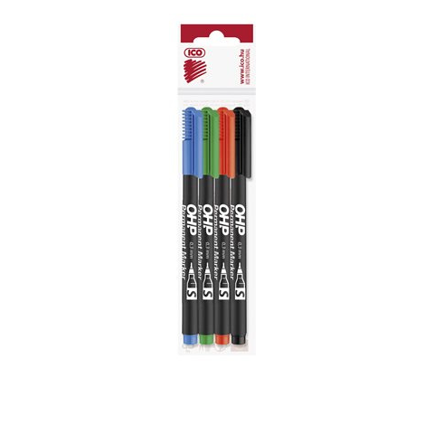 Alkoholos marker készlet, S, OHP Ico, 4 klf.szín élénk színekkel és tartós tintával emeli ki a legfontosabb részleteket. - alkoholbázisú tintával töltött alkoholos filc készlet kék, zöld, piros és fekete színekkel - műanyag, üveg, fém, fa, illetve szi