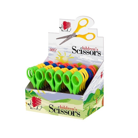 Kerekített vágóél végződésű iskolai olló. Méret: 13cm.