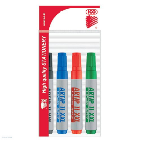 Flipchart táblák és egyéb papírívek feliratozására alkalmas, vízbázisú festékkel töltött marker. A festék a papír másik oldalára nem üt át. Megnövelt élettartam a nagyobb méretű testnek köszönhetően. Kerekített csúccsal. 4 színben és 4 db-os készletbe