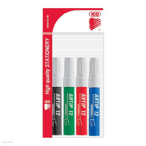 Flipchart táblák és egyéb papírívek feliratozására alkalmas, vízbázisú festékkel töltött marker. A festék a papír másik oldalára nem üt át. Vágott csúccsal. 4 színben és 4 db-os készletben. Vonalvastagság: 1-4 mm. .