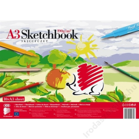 Skiccfüzet, A3, 190 g, ICO Süni (TICSUSFA3) A/3-es méretű kiváló minőségű magas fehérségű papírból gyártott 10 lapos 190 gramm/m2 Gyártó/első EU forgalmazó elérhetősége: ICO ZRT 2013 Pomáz, ICO út 5.; EU post@ico.eu www.ico.eu