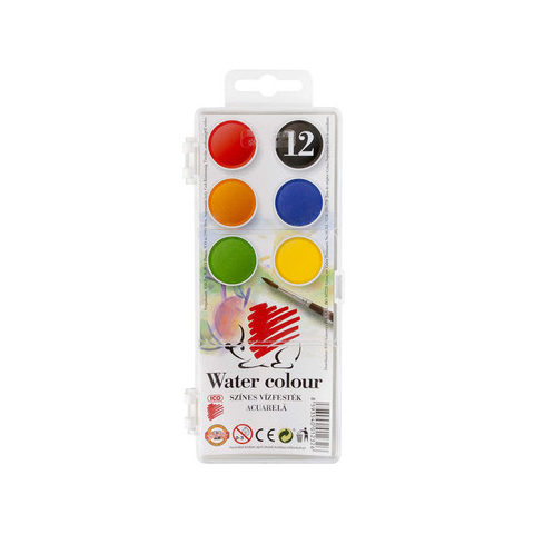 Kisebb méretű ICO vízfesték készlet, 12 különböző színben. A csomag csak a festékkorongokat tartalmazza, ecset nem található a dobozban. Alkalmas iskolai és hobbi célra egyaránt.