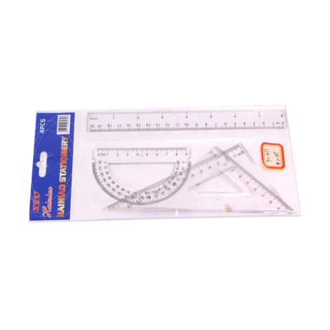 Vonalzó készlet 4 darabos, 1 db 20 cm egyenes vonalzó, 1 db 45°-os 10 cm vonalzó, 1db 60°-os 13 cm vonalzó, 1 db szögmérő