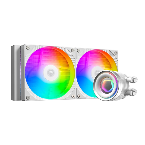 Kompakt, univerzális vízhűtés 2 darab 120mm-es vezérelhető ARGB világítású, PWM szabályzású ventilátorral, 240mm-es radiátorral és vezérelhető gyűrűs ARGB világítású CPU vízhűtés blokkal 350W TDP-i...