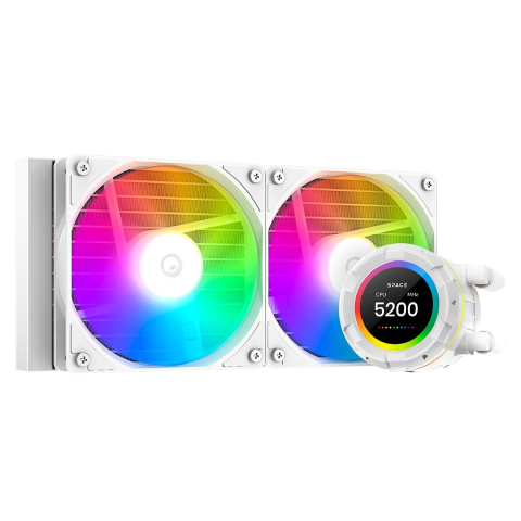 Kompakt, univerzális CPU hűtő 2 darab 120mm-es vezérelhető ARGB világítású és PWM sebesség szabályzású ventilátorral, 240mm-es radiátorral és vezérelhető gyűrűs ARGB világítású CPU hűtőblokkal amir...