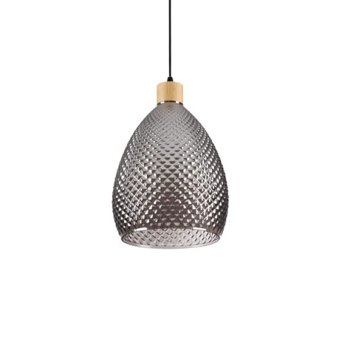A Bergen függesztett lámpa a klasszikusan berendezett belső terekhez illik, és különleges darabja lehet konyhájának, étkezőjének. A lámpabúra füst színű fúvott üvegből készült, és dekoratív, gyémánt alakú dombornyomások borítják, a tetején természetes fad..