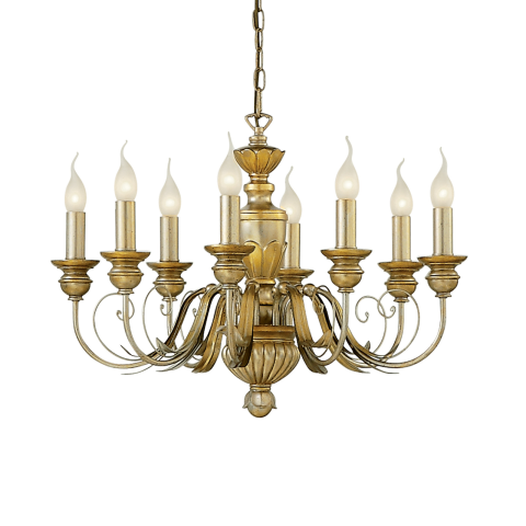 Különleges csillár, amelynek lámpateste gyantából készült, kézzel készített fém karokkal, és kézzel díszített aranylevéllel, antikolt hatással. Javasoljuk, hogy válasszon LED-es gyertyaizzót, amely kiemeli a lámpa rusztikus megjelenését, és egyben elektro..