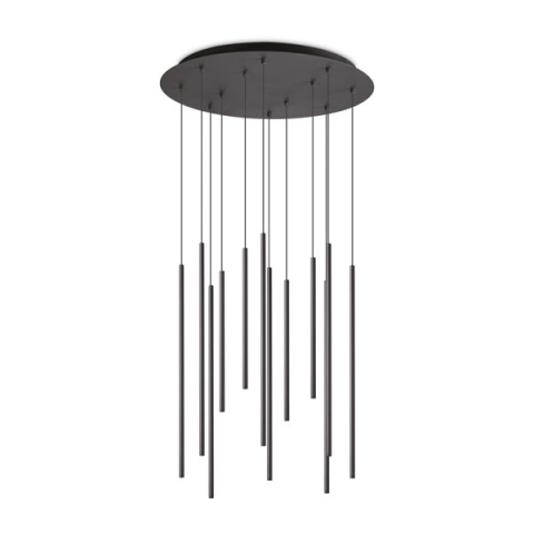 Modern, stílusos LED függesztett lámpa, elegáns formában a Filo sorozatból. Kerek fém talpból és tizenkét lelógó hosszú hengeres fémtestből áll, háromféle színben érhető el...
