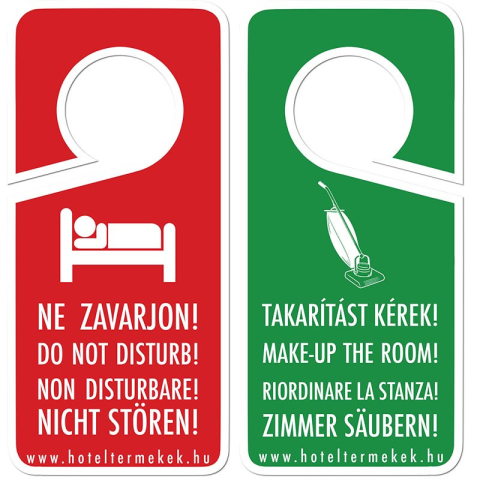 Két oldalú kialakítása és színei megkönnyítik az üzenetek megkülönböztetését. Bevágott nyílása megkönnyíti a felhelyezést szinte bármilyen méretű és kialakítású kilincsre. Négy nyelven szerepel rajta az üzenet, így a más nemzetiségű vendégek is könnyen h