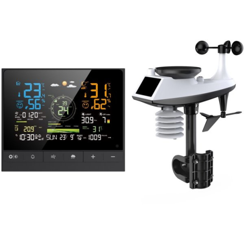 Időjárás állomás - professzionális, vezeték nélküli, WiFi 2,4 GHz csatlakozás, beltéri és kültéri használatra, okos funkciókkal, előrejelzéssel és valós idejű időjáráskövetéssel, ismételt ébresztés, ébresztőóra, alacsony elemfeszültség jelzése, mérési érték riasztás, időzóna beállítások, max. és min. érték memória és csatlakozás mobilalkalmazással, mért értékek: légnyomás, hőérzet, harmatpont, szélsebesség és irány, napsugárzás, le