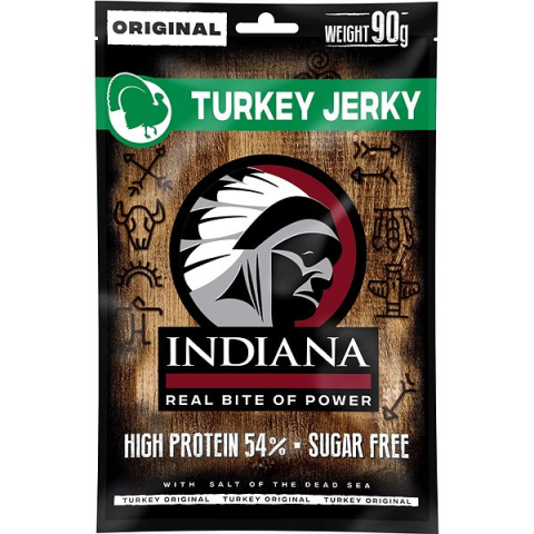 Szárított hús - jerky, pulyka, a termék laktózmentes, pálmaolaj nélküli, hozzáadott cukor nélküli, valamint gluténmentes, 100 g termék 225 g nyers hús felhasználásával készül, 54 g fehérjét tartalmaz, valamint energiatartalma 243 kcal / 100 g, 90 g-os kiszerelés Indiana szárított húspulyka Original, 90 gA sportolók és az aktív túrázók számára az Indiana Jerky zacskó pulykaszelet tökéletes választás egy gyors és tápláló snackhez. Ez a könnyű, nem zsíro