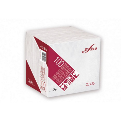 Infibra Szalvéta 25x25cm fehér 2 réteg 100 lap/csomag Infibra Szalvéta 25x25cm fehér - szalvéta - fehér színű - 2 rétegű - 25x25 cm/lap - 100 lap/csomag - 30 csomag/karton (3000 lap)