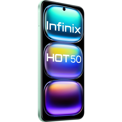 Mobiltelefon - 6,7"-es IPS kijelző 1600 × 720 felbontással (120Hz), 4 GB RAM, 128 GB belső tárhely, dual SIM + memóriakártya, MediaTek Dimensity 6300 processzor, kameramodul: 48Mpx (f/1,8) + 48Mpx széles látószögű, 8Mpx felbontású előlapi kamera, GPS, LTE, 5G, USB-C csatlakozó, gyorstöltés 18W, 5000 mAh kapacitású akkumulátor, megjelenés éve 2025, Android operációs rendszer Az Infinix Hot 50 5G-vel a szórakozás új szintre lép a villámgyors 5G internetnek köszönhet