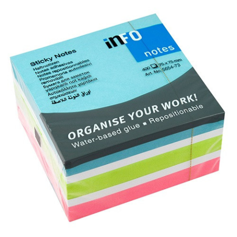 Öntapadós jegyzettömb Info Notes Mix 75x75 mm 400 lapos színes-fehér Méret: 75 x 75 mmLap: 400 laposSzín: vegyes színek - fehérOldószermentes ragasztó