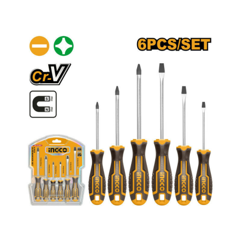 INGCO Csavarhúzó készlet 6 részes mágneses CrV Méretek:, 1 db SL5.5 x 5 x 75 mm, 1 db SL5.5 x 5 x 100 mm, 1 db SL6.5 x 6 x 150 mm, 1 db PH1 x 5 x 75 mm, 1 db PH1 x 5 x 100 mm, 1 db PH2 x 6 x 150 mmErős mágnessel Szállítási terjedelem: 6 db csavarhúzó C
