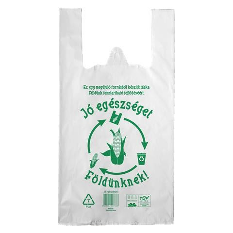 Környezetbarát, komposztálható, biológiai úton lebomló (PLA), megújuló forrásból származó, kukoricakeményítő alapú ingvállas táska. Megfelel az MSZ EN 13432:2000 szabványnak.