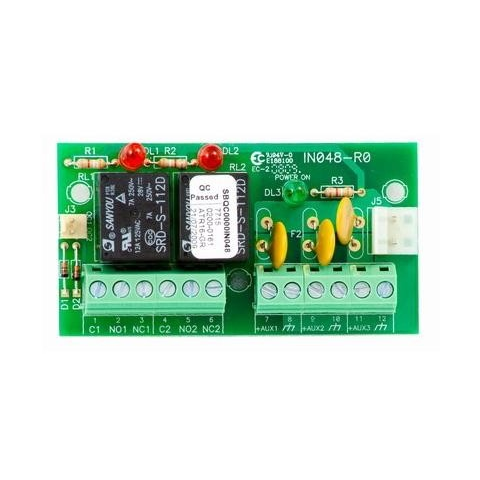 INIM AUXREL32 Tápfeszültség osztó és relés kimeneti modul; OC kimenetre kapcsolható 2db váltókontaktusos relével, 3db 1A-es önvisszaálló (multifuse) feszültségkimenettel; 1050L és 10100L központok dobozába építhető