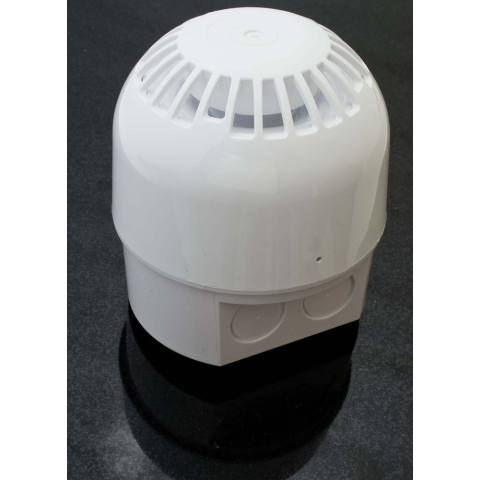 Inim ES0010WE címezhető huroktáplált hangjelző, fehér. Közvetlen az érzékelőhurokra kapcsolható. Vízálló kivitel, IP67, kültéren is alkalmazható. Max. 106 dB(A) (állítható), 32 választható hang, 9...60 V DC, 4-41mA (hangtól függően) áramfelvétel.