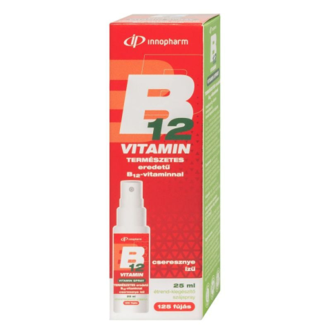 Az InnoPharm B12-vitamin cseresznye ízű étrend-kiegészítő szájspray 250 µg természetes eredetű B12-vitamint tartalmaz.
