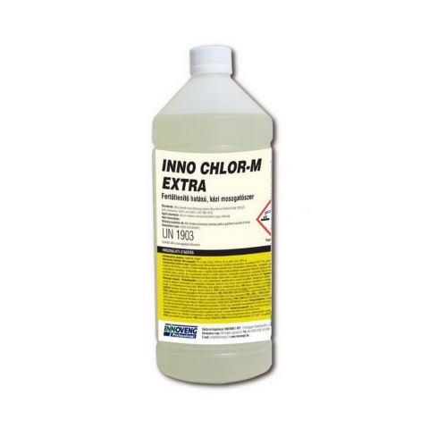 Inno Chlor M Extra klóros fertőtlenítő hatású kézi mosogatószer 1L INNO CHLOR-M EXTRA fertőtlenítő hatású kézi mosogatószer 1L - fertőtlenítő hatású kézi mosogatószer - klór tartalmú - 70 °C felett ne használjuk - baktericid, fungicid - előírt alkalmaz