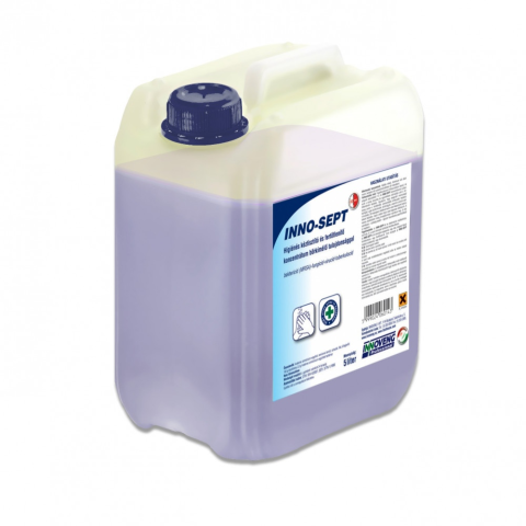 INNO-SEPT fertőtlenítő kéztisztító 5L - higiénés fertőtlenítő kéztisztító és betegfürdető koncentrátum - antimikrobiális hatásspektrum: baktericid (MRSA) – yeasticid – fungicid – tuberkulocid – Hepatitis B vírus – sz. virucid (burkos vírus, H5N1 is) -