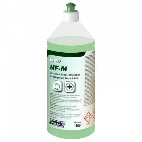 INNOFLUID MF-M fertőtlenítő mosogatószer 1L - emelt zsíroldó hatású, fertőtlenítő kézi mosogatószer koncentrátum - antimikrobiális spektrum: baktericid, fungicid - előírt koncentráció: 2,0 %, hőmérséklet: 40 °C, hatási idő: 5 perc Foglalkozásszerű fe