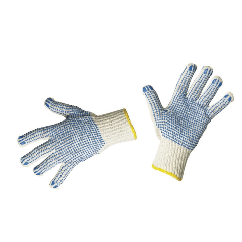 Varratmentes, kötött poliészter kesztyű, mindkét oldalon PVC korongokkal borítva. Főleg száraz környezetben történő munkára használhatóak. Egyszeri vagy rövid távú használatra. Nem alkalmasak hegesztésre, vegyszerek és 50°C-nál magasabb hőmérsékletű éles vagy forró tárgyak kezelésére. 12 pár egy csomagban, 10-es méret, fehér szín.