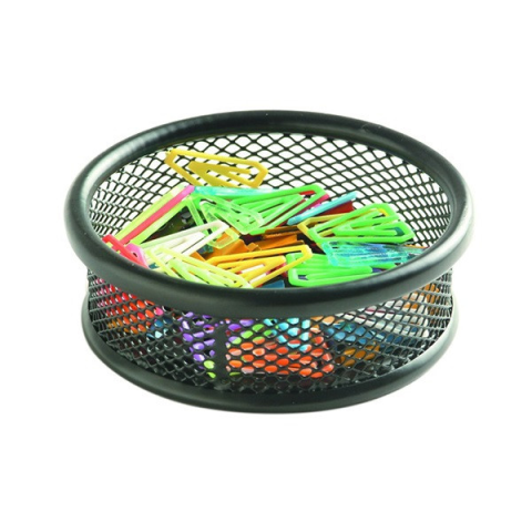 A gemkapcsok rendszerezésére alkalmas szép, fémhálós tartó. elegáns asztali kiegészítő ideális az irodába átmérő: 9 cm szín: fekete