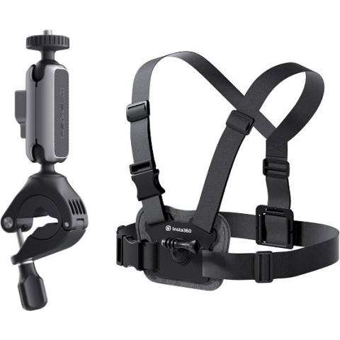 Akciókamera kiegészítő - kompatibilis az Insta360 ONE X2 / ONE R / ONE RS / GO 2 / GO 3 / X3 kamerákkal, tartalma: mellkaspánt és tartó kormányra, a kamera közvetlenül a tartó állványcsavarára csatlakozik
