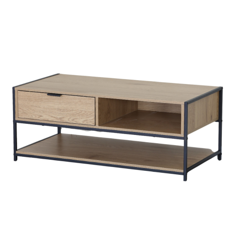 Intenso Compact dohányzóasztal 100 x 50 cm-es asztal felülettel, beépített felső fiókkal és nyitott tároló egységgel, porfestett rozsdamentes fekete acél vázzal. Modern, letisztult formatervezés, masszív acél váz és természetes tölgy árnyalatú asztallap.