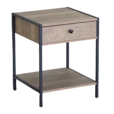 Éjjeliszekrény / univerzális oldalsó kisasztal fiókkal, ami tökéletesen használható szinte minden helyiségben. Modern, letisztult formatervezés, masszív acél váz és tölgy árnyalatú bútorlap. Anyaga 15 mm-es E1 MDF bútorlap ABS élfóliákkal, ami ellenáll a
