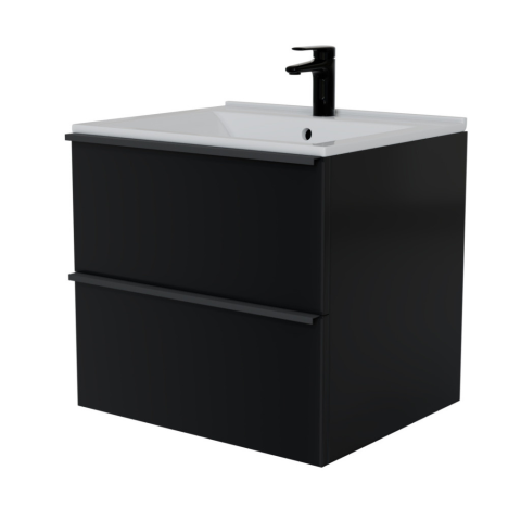 Intenso fiókos mosdószekrény magasfényű fekete felülettel. A fiók előlapok mellett az oldalak is magasfényű felülettel rendelkeznek. 2 fiókos mosdószekrény, modern, hosszított kialakítású fekete fogantyúkkal az fiókokon. 15 mm vastag fiók front bútorkapok