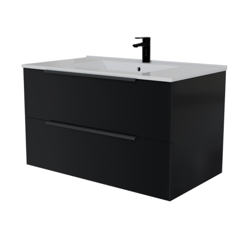 Intenso fiókos fürdőszobai alsószekrény mosdókagylóval, magasfényű fekete felülettel. A fiók előlapok mellett az oldalak is magasfényű fekete felülettel rendelkeznek. 2 fiókos mosdószekrény, modern, hosszított kialakítású fekete fogantyúkkal a fiókokon. 1