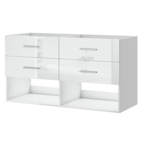 Intenso Verso-Duo kétszemélyes dupla mosdószekrény magasfényű fehér felülettel. 2x2 fiókos kialakítás nyitott alsó polcokkal, ami ideális törölközők és higéniai eszközök tárolására. A bútor telepíthető falra, vagy a padlóra is, a csomagban található 5 db