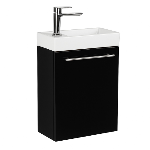 Intenso fürdőszobai falra telepíthető alsószekrény. Méreténél fogva ideális WC-be és egyéb kisebb helyiségekbe ahol helytakarékos megoldás szükséges. A teljes bútor magasfényű fekete felülettel készül, így az ajtólap mellett az oldalak is magasfényű felül