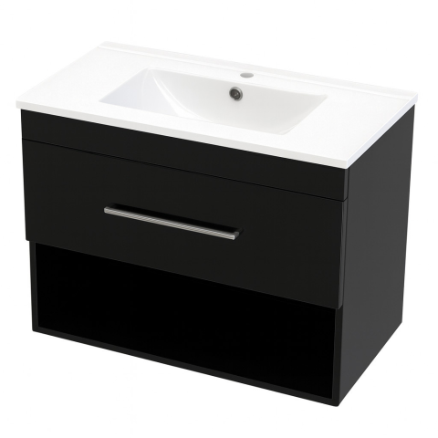 Intenso Verso mosdószekrény magasfényű fekete felülettel. Egy fiókos kialakítás nyitott alsó polccal, ami ideális törölközők és higéniai eszközök tárolására. A fiók előlap mellett az oldalak is magasfényű felülettel készülnek. Az élek ABS élfóliával vanna