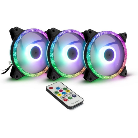 3 darab különleges kristály hatású, vezérelhető-gyűrűs RGB világítású 120mm-es házhűtő ventilátor PWM sebesség szabályozással.