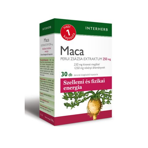 INTERHERB MACA PERUI ZSÁZSA KAPSZULA - 30 DB Szellemi és fizikai energia 250 mg extraktum megfelel 1250 mg növényi őrleménynek 30 db étrend-kiegészítő kapszula A Maca, az indiánok évszázadok óta fogyasztott energiát adó, vitalizáló növ
