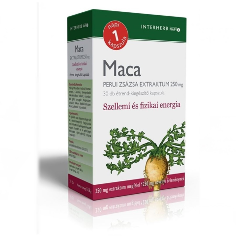 Interherb napi1 maca perui zsázsa extraktum kapszula 30 db A Maca, az indiánok évszázadok óta fogyasztott energiát adó, vitalizáló növénye, mely hitük szerint felfrissíti, életerővel tölti fel a szervezetet. A Maca extraktum a perui vörös zsázsa gumójá