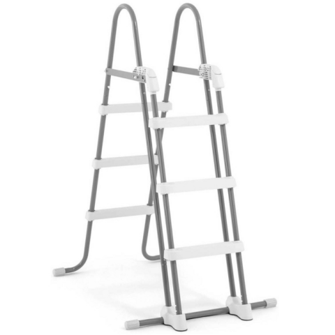 Medencelétra - medence maximális magassága 1,07 m, teherbírása 130 kg, Az Intex medence biztonsági lépcső alkalmas olyan úszómedencékhez, amelyek falmagassága 91 cm - 1,07 m közötti. A csúszásmentes lépcsőfokok és egy platform segítségével biztosítják a medencébe való ké