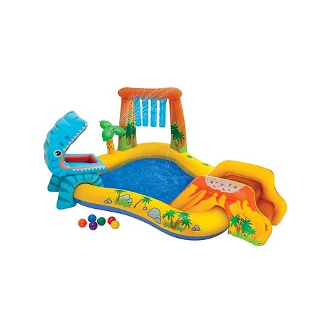 Medence játékközpont - felfújható, csúszda, dekoratív kiegészítők, javítókészlet és labdák a felszerelés része, űrtartalma 310 l, anyaga PVC, állat és természet motívum, kék, fehér, zöld, sárga, piros és narancssárga kivitel, ajánlott 2 éves kortól, mérete 249 × 191 × 109 cm (Sz×H×Ma) Gyermek vízi játszótér csúszdával, zuhanyozó és örökké éhes dinoszaurusz. Ugyancsak ide tartozik 6 db ballonok. Alkalmas gyermekeknek 3 éves. Felfújható gyermek v