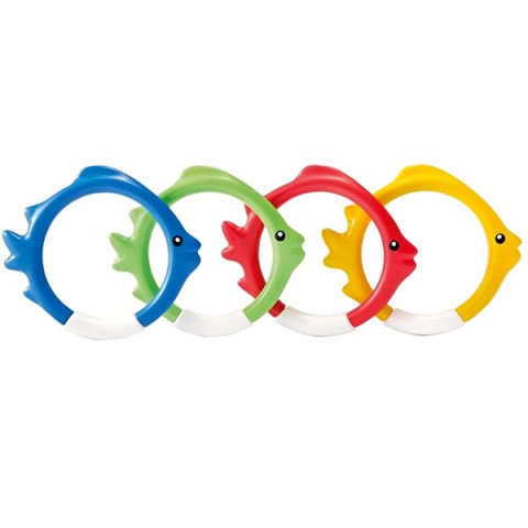 Fürdőjáték - gyerek, halacskák, fiúknak és lányoknak 6 éves kortól, 4 darab a csomagban Élvezd még jobban a vízi játékokat ezekkel az Intex merülő gyűrűkkel, amelyeknek aranyos, hal formájuk van. A csomag 4 darabot tartalmaz kék, zöld, piros és sárga színben. Puha és biztonságos any
