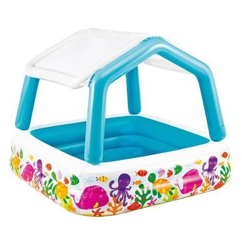 Élvezze a végtelen szórakozást a forró nyári napokon, és hűsöljön az árnyékban ezzel az Intex felfújható napernyővel! Ez a gyerekmedence erős vinilből készült, így erős és tartós. A medence mérete 157x157x122 cm, és 295 liter víz befogadására alkalmas. A széles oldalfalak és az extra széles napernyő maximális játékidőt biztosít árnyékos kényelemben. A napernyő levehető, egyszerűen vegye le a medencéről, és élvezze a játékot a napon. A színes teng