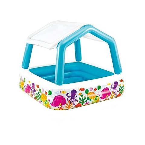 Gyerekmedence - 2 éves kortól ajánlott, 295 l űrtartalom, négyszögletű forma, felfújható, tető, leeresztő szelep és javítókészlet a termék része, kék, fehér, zöld, sárga, piros, rózsaszín és bézs kivitel, állat és tenger motívum, anyaga PVC, méretei 122 × 157 × 157 cm (ma × szé × h), vízszint magassága 22 cm Gyermek felfújható medence gyönyörű kialakítással, ahol a gyerekek élvezhetik a sok szórakozást és élvezetet.A gyerekeid szeretnek a vízben j