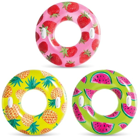 Úszógumi - felfújható, vízbe, gyerekeknek és felnőtteknek, többszínű kivitel, 80 kg teherbírás, fogantyúk a termék része, anyaga vinyl, 107 cm átmérő, javítókészlet a csomagban - 1 db a csomagban , az egyes termékváltozatok közül nem lehetséges választani A stílusos INTEX Trópusi gyümölcs mintás úszógumi fontosabb paraméterei A nagyszerű, kisebb gyermekek és idősebb gyermekek és felnőttek számára szánt INTEX úszógumi garantálja a vidám időtöltést