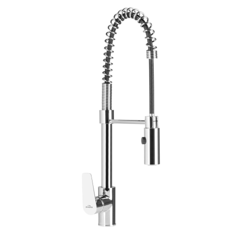Modern mosogató csaptelep, amely ideális szigetet tartalmazó konyhákhoz. Impozáns formája miatt nagy helyiségekbe ajánlott. A klasszikus króm rugó formájú és a fekete tömlő kombinációja érdekessé, szokatlanná és nagyon modernné teszi a terméket. A kétfunk