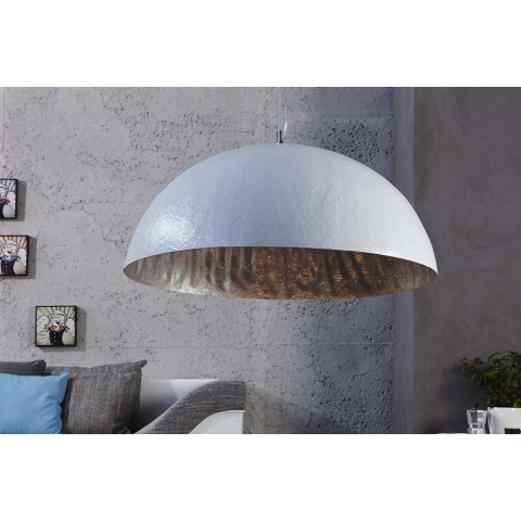 Stílusos lámpa Glimer 50 cm fehér - ezüst Elegáns függőlámpa Glimer fehér színben és ezüst retró belsővel! Egyszerű és speciális - a nemes ezüst belseje szépen tükrözi a fénysugarakat és meleg fényt teremt. Méretek (kb.): Teljes átmérő: 50 cm Magasság: 25