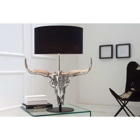 Asztali lámpa Randal 68 cm / fekete Szeretne szobájába ideális megvilágítást, de egyben egy extravagáns darabot is, amely a vadont és a kalandokat idézi? Akkor válassza a Randal asztali lámpát. A nagy, kör alakú, fekete színű árnyékoló egy bika koponya fo