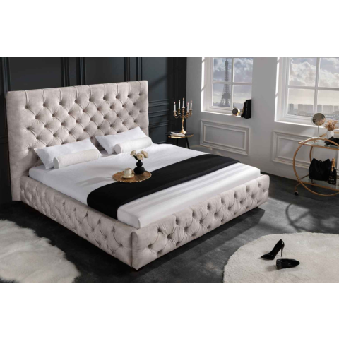Design ágy Laney 160 x 200 cm pezsgő bársony A népszerű Chesterfield foltvarrással díszített, pompás Laney franciaágy mindenki figyelmét felkelti. A kiváló minőségű bársonyból készült huzat nemes jelleget kölcsönöz neki. A fekete fa lábak harmonikus kontr